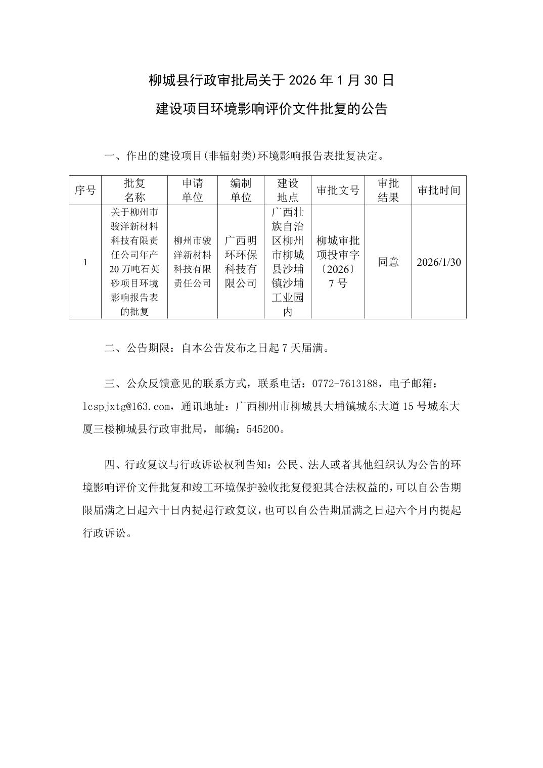 〔2026〕7號(hào)-關(guān)于柳州市駿洋新材料科技有限責(zé)任公司年產(chǎn)20萬(wàn)噸石英砂項(xiàng)目環(huán)境影響報(bào)告表的批復(fù).docx