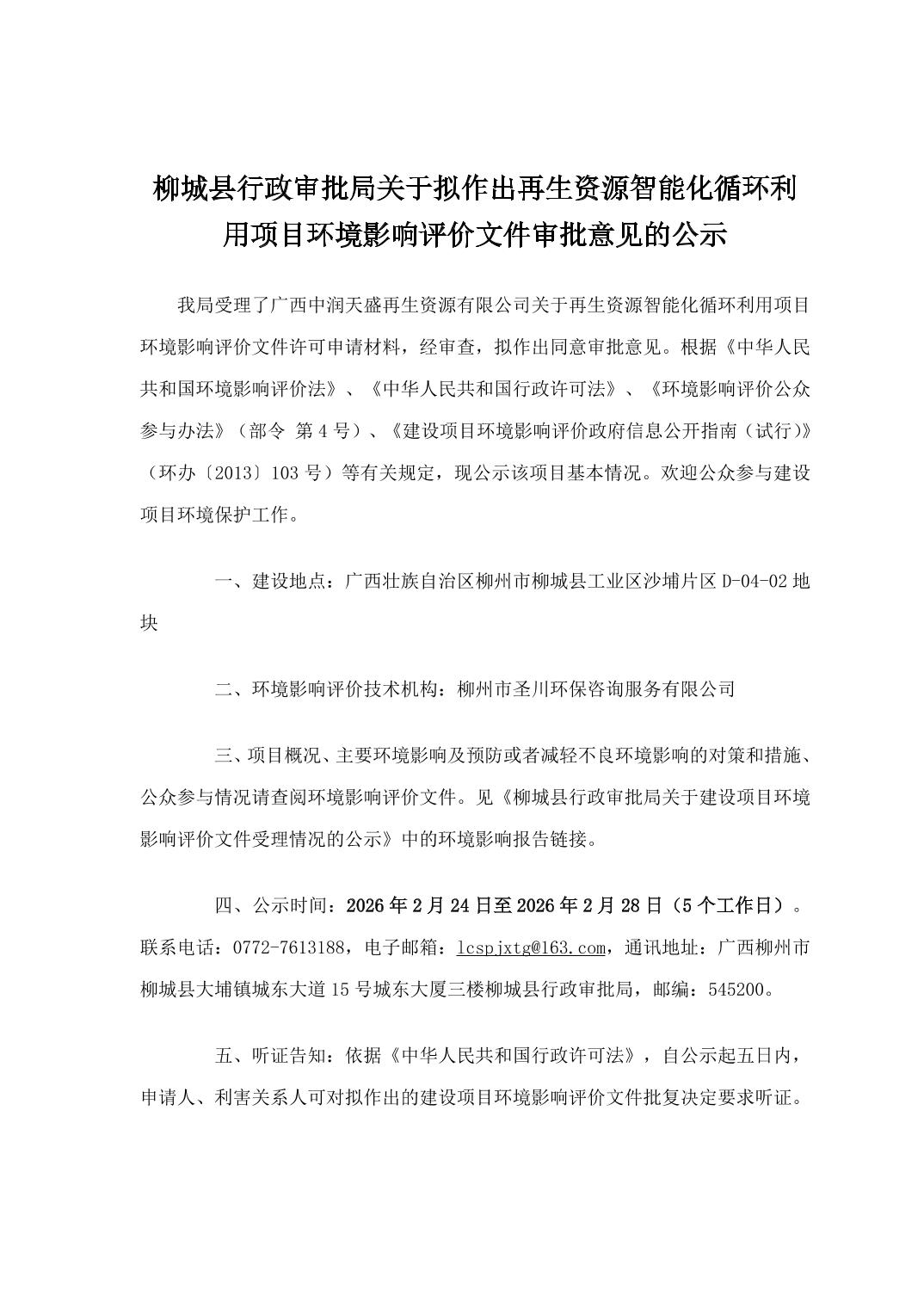 柳城縣行政審批局關(guān)于擬作出再生資源智能化循環(huán)利用項目環(huán)境影響評價文件審批意見的公示
