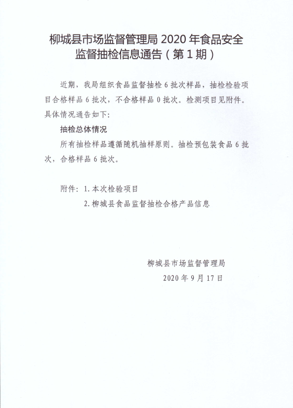 柳城縣市場監(jiān)督管理局2020年食品安全監(jiān)督抽檢信息通告(第1期)
