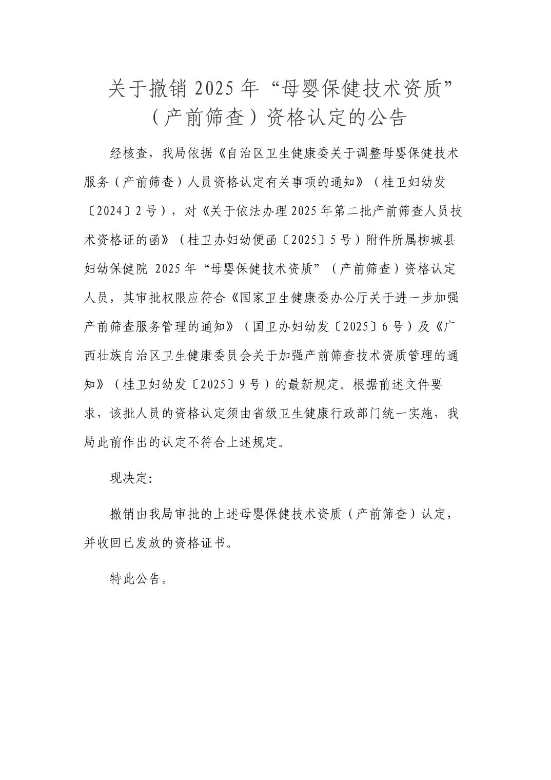 關(guān)于撤銷2025年“母嬰保健技術(shù)資質(zhì)”(產(chǎn)前篩查)資格認定的公告