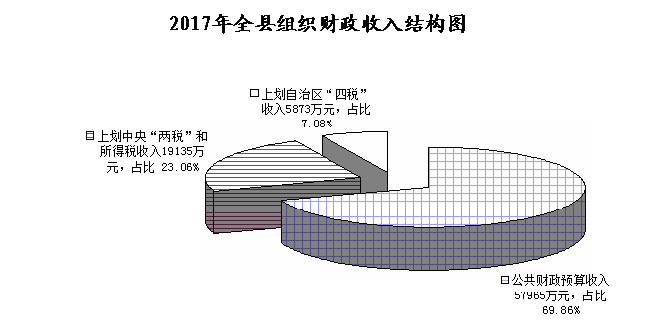(一)公共財政預算收入執(zhí)行情況。2017年全縣組織財政收入82,973萬元,為預算數(shù)82,700萬元的100.33%,同比增長6.12%。其中:公共財政預算收入完成57,965萬元,為預算數(shù)54,778萬元的105.82%,同比增長10.75%;上劃中央收入19,135萬元,為預算數(shù)22,150萬元的86.38%,同比下降1.83%;上劃自治區(qū)四稅收入5,873萬元,為預算數(shù)5,772萬元的101.77%,同比下降7.57%。